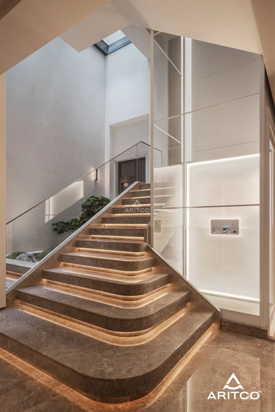 明亮整潔的井道營(yíng)造出與室外無(wú)縫銜接的視覺(jué)體驗(yàn),通過(guò)玻璃井道,矮松映入眼簾,與大理石臺(tái)階相互交錯(cuò)。