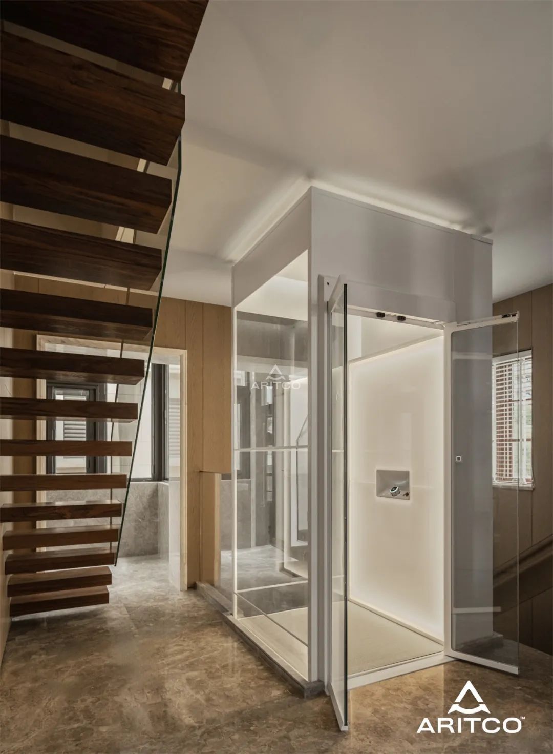 一改傳統(tǒng)電梯沉重的金屬外觀,外觀優(yōu)雅的瑞特科S系列家用電梯不僅提供了便捷的垂直交通,更是欣賞盆景綠植的絕佳觀景臺(tái),完美融合于這棟別墅之中。